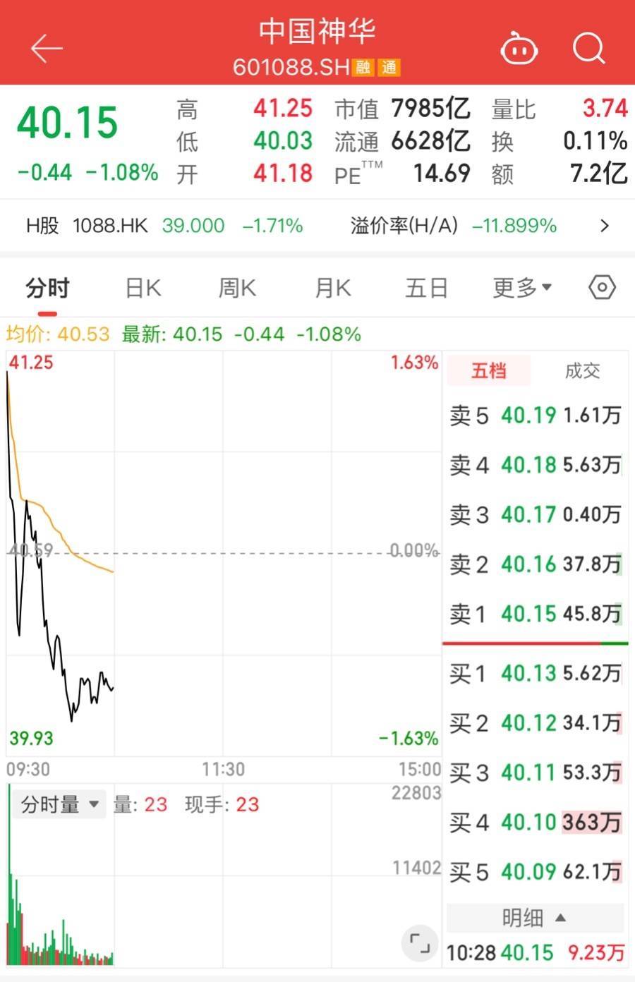 12月22日,A股煤炭龙头中国神华(601088.SH)股价呈现高开低走态势。开盘一度涨超1%,股价报41.18元/股,总市值突破8000亿元,但随后股价逐步走低。截至上午10:28,股价报40.15元/股,转为下跌1.05%明利配资,总市值随之回落至8000亿元以下。