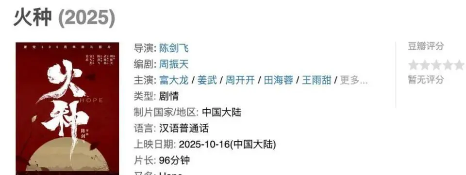 同期另一部主旋律电影《茯战》单日票房甚至不足1500元,连影院电费都赚不回来。 而《火种》的豆瓣评分低至3.2分,几乎清一色的一星差评,有观众讽刺道:“不是红色题材不灵了,是没人敢信红色能压住人设崩塌的灰”。