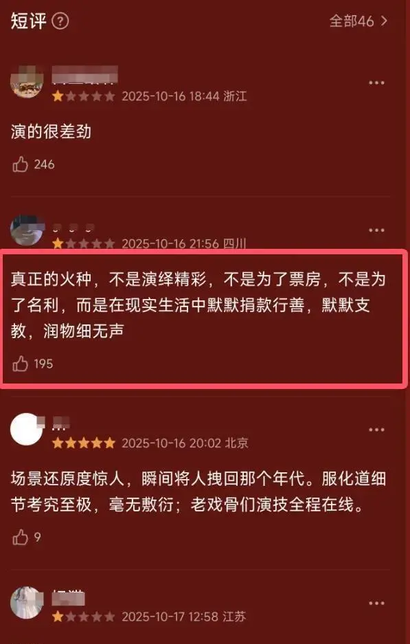 业内人士透露,田海蓉团队早年瞧不上这类“苦情戏”,后来因代言争议才将《火种》当作“避险牌”。 剧本未经过细致打磨,史料研究浮于表面,连主角赵纫兰的家乡口音都出现错误。 这种创作态度与成功案例形成鲜明对比。 《我和我的祖国》通过普通人的故事折射大时代,《革命者》以李大钊被执行绞刑前38小时为主线,多时空辐射革命历程。